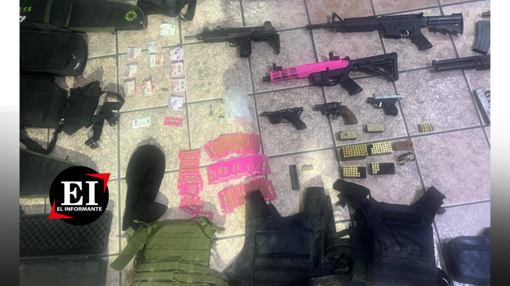 Durante la inspección, los elementos aseguraron cinco armas largas —entre ellas una carabina M4, una escopeta calibre 12 y un rifle MP 15—, tres armas cortas y cientos de cartuchos de calibres como .223, 9, 12, 22, 25 y 38 mm. También se confiscaron chalecos tácticos, cargadores y fornituras.