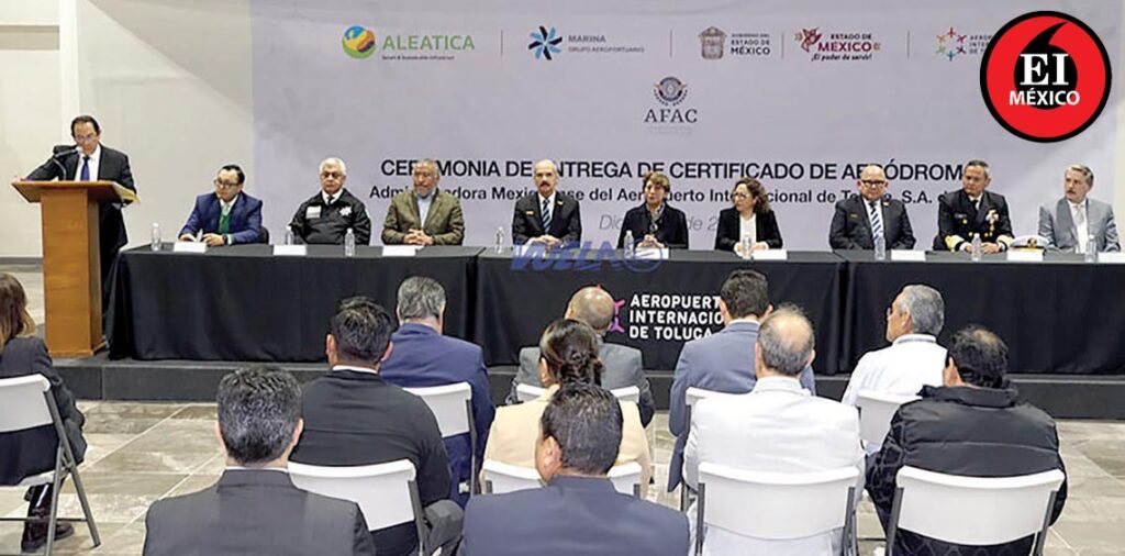 La gobernadora del Estado de México, Delfina Gómez Álvarez, atestiguó la entrega de la Certificación de Aeródromo al Aeropuerto Internacional de Toluca (AIT), documento que lo acredita como un espacio que cumple con los estándares de seguridad y operación para garantizar vuelos seguros.