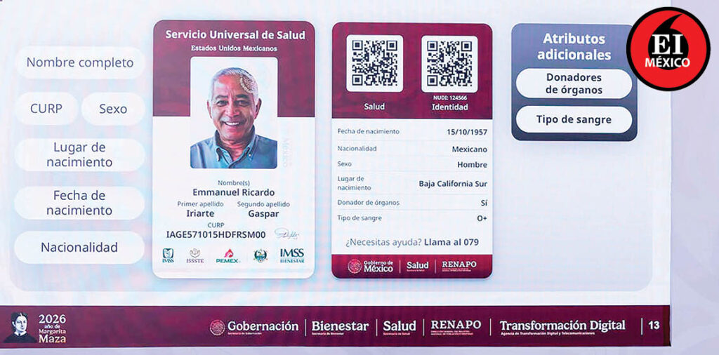 La presidenta Claudia Sheinbaum Pardo anunció que, del 2 de marzo al 31 de diciembre de 2026, se llevará a cabo el proceso de credencialización del Servicio Universal de Salud; la identificación garantizará el derecho a la salud en las instituciones de salud pública del Gobierno de México, como el Instituto Mexicano del Seguro Social (IMSS), Instituto de Seguridad y Servicios Sociales de los Trabajadores del Estado (ISSSTE), el IMSS Bienestar, así como en los servicios de salud de las Fuerzas Armadas y los Institutos Nacionales de Salud.